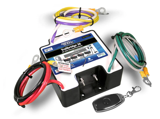 The Trollbridge 36 allows you to charge your 36-Volt trolling motor batteries from the 12-Volt alternator on your main engine, from your trailer hookup, or from any single output 12-Volt battery charger. It works automatically by connecting the three (3) 12-Volt trolling motor batteries in series for trolling motor mode and connecting them in parallel for charging mode.